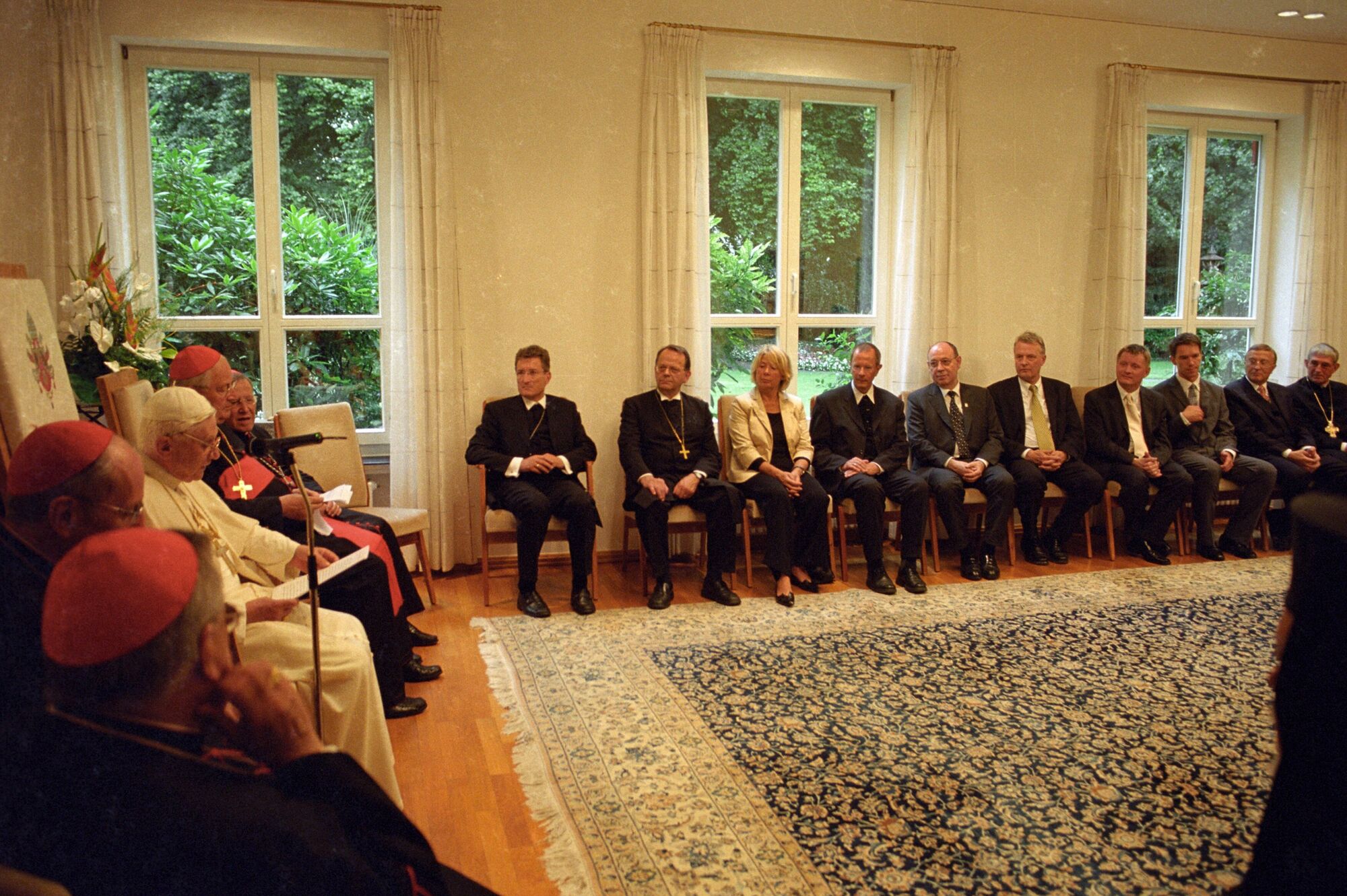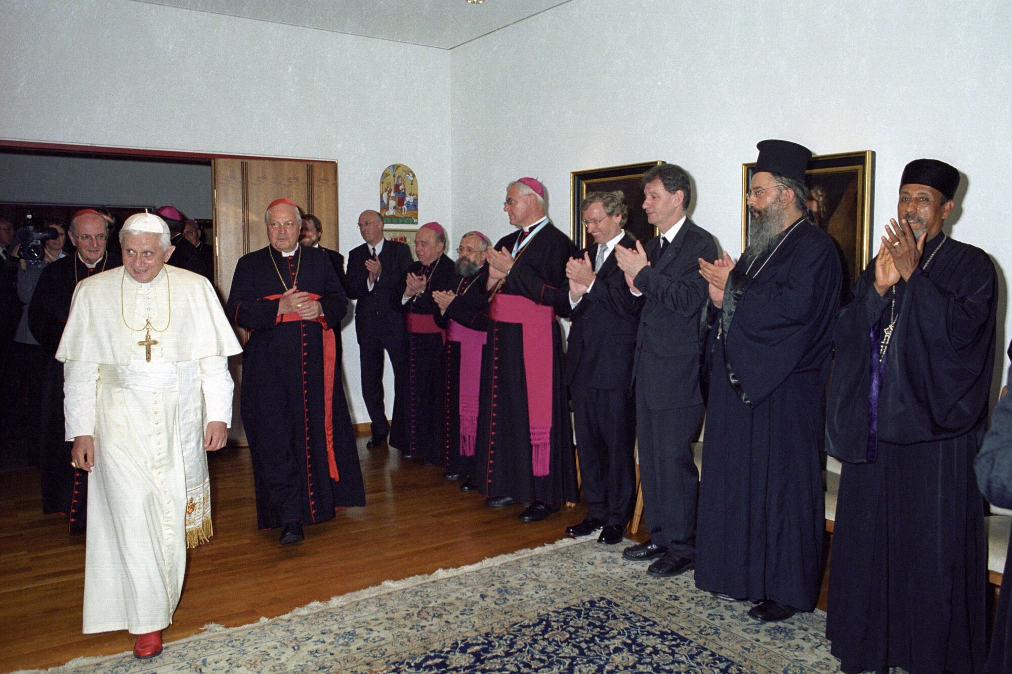 (Từ trái qua) Hồng y Joachim Meisner, Đức Giáo hoàng Bênêđictô XVI, Hồng y Quốc Vụ Khanh Angelo Sodano và Hồng y Walter Kasper lắng nghe bài phát biểu của Đức Giám mục Wolfgang Huber, Chủ tịch Hội đồng Hội thánh Tin lành tại Đức.