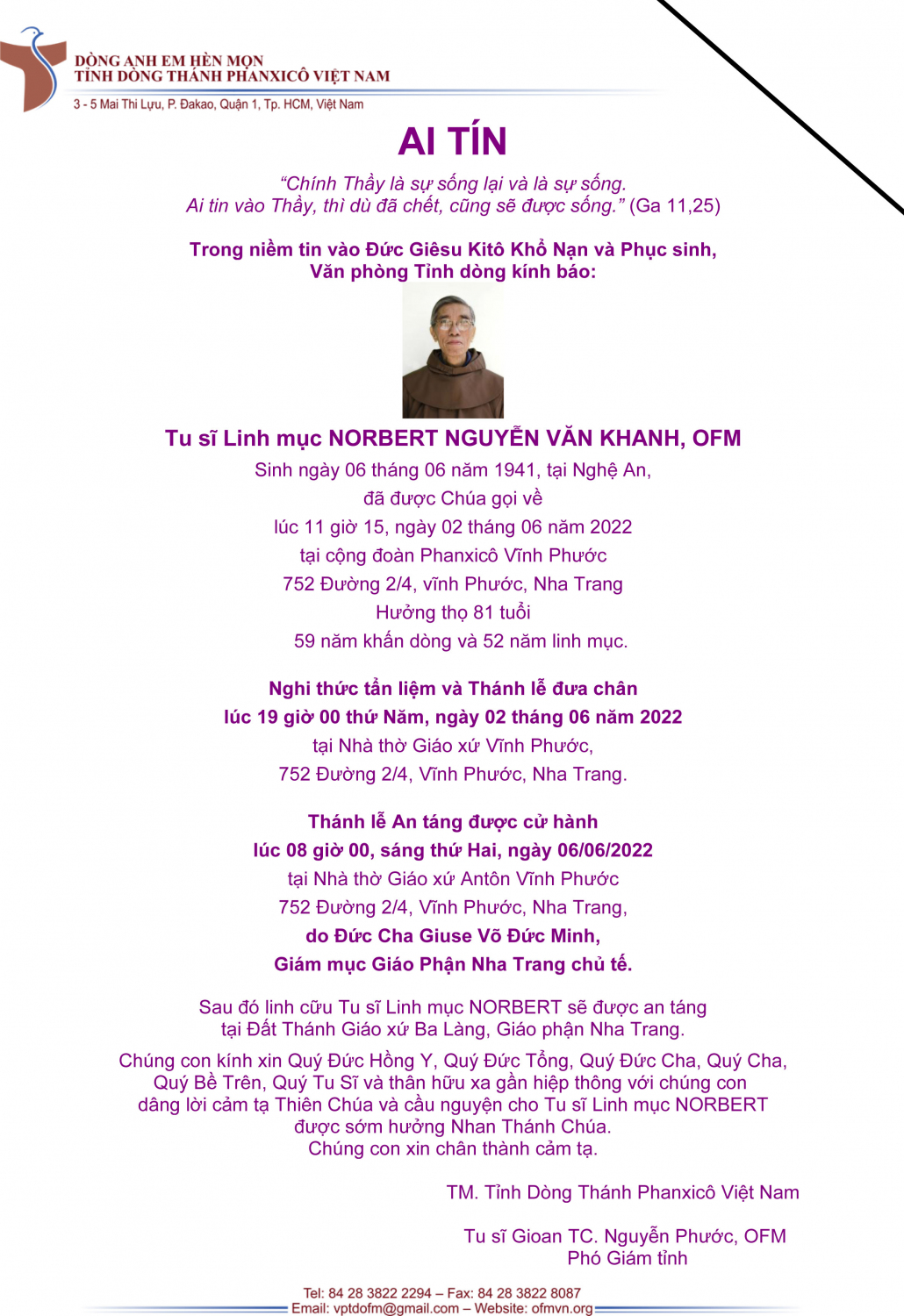 Đại Chủng viện Sao Biển Nha Trang xin phân ưu cùng Tỉnh Dòng Thánh Phanxicô Việt Nam, và Gia đình linh tông, huyết tộc của Cha giáo Norbert.