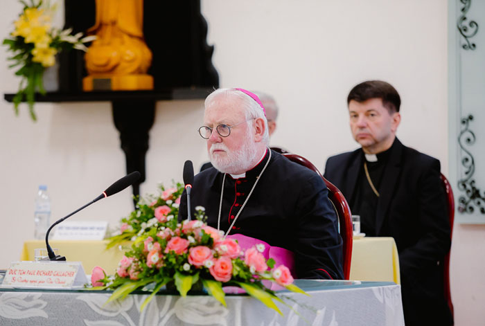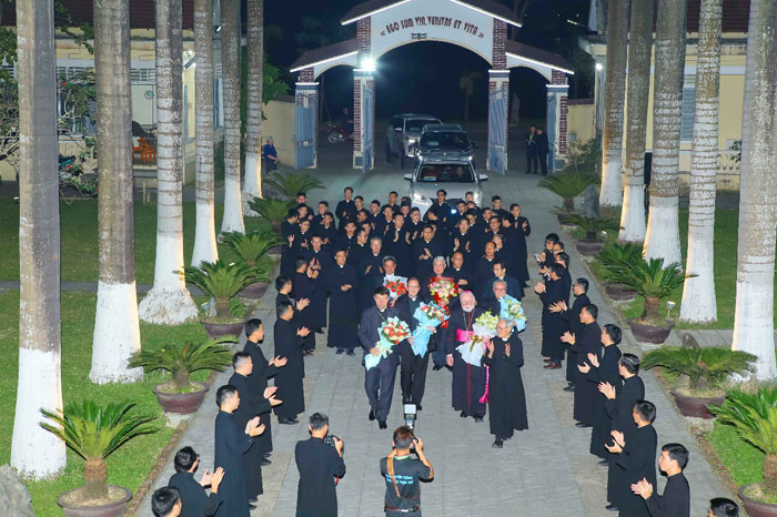 Thật là một niềm vui lớn lao cho tôi được có mặt với các bạn trong chuyến thăm chính thức đầu tiên này của tôi đến Việt Nam. Tôi chọn từ “niềm vui” vì một lý do: Ít lâu sau khi được bầu chọn làm Giáo hoàng, Đức thánh cha Phanxicô đã gặp gỡ các chủng sinh từ khắp nơi trên thế giới, và ngài đã nói về tầm quan trọng của niềm vui. Trong cuộc gặp gỡ ấy, ngài nói: “Niềm vui đích thực không đến từ các thứ đồ vật hay từ sự chiếm hữu, không! Nó đến từ sự gặp gỡ, từ mối tương quan với người khác, nó đến từ cảm giác mình được chấp nhận, được cảm thông và được yêu thương, cũng như từ việc chấp nhận người, cảm thông người và yêu thương người” (ĐGH Phanxicô, Gặp gỡ các chủng sinh và các tập sinh, ngày 6.7.2013).