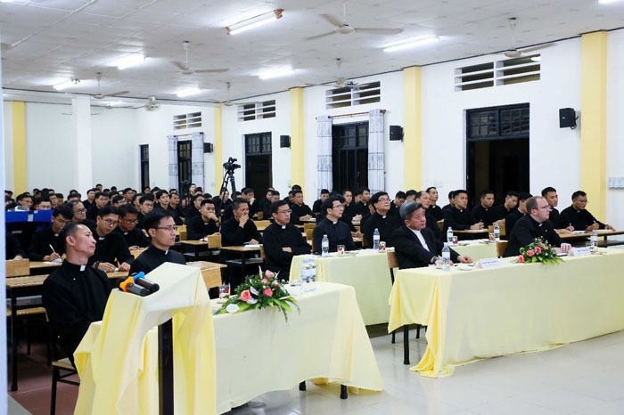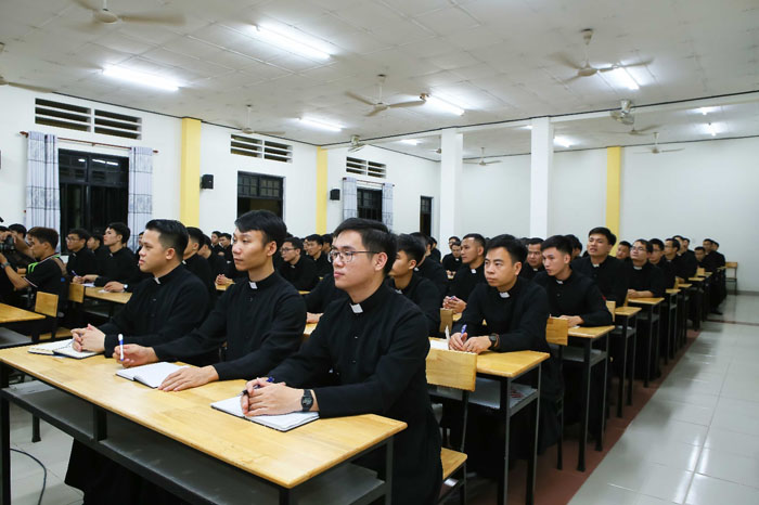 Các bạn chủng sinh thân mến, Đức thánh cha đang nói với các bạn trong lời kêu gọi tha thiết ấy. Giáo hội cần các linh mục là những nhà thừa sai bác ái, được sai vào trong thế giới, với đầy tràn niềm vui có sức thúc đẩy mình nói “vâng” với Đức Giêsu Kitô mỗi ngày, ngay cả những khi mà điều đó có nghĩa là nói “không” đối với những sở thích riêng, những khao khát riêng, những dự tính riêng của chúng ta. Thật vậy, có thể nói rằng tất cả việc cầu nguyện, việc đào tạo, học tập và rèn luyện mà các bạn trải qua ở đây trong chủng viện này có mục tiêu là: đào tạo những chàng trai có khả năng chuyển hóa cách chân thực và nhất quán niềm vui mà họ kinh nghiệm trong việc gặp gỡ Chúa Giêsu thành những thực hành cụ thể của bác ái, khi họ thực thi sứ vụ bí tích của mình.