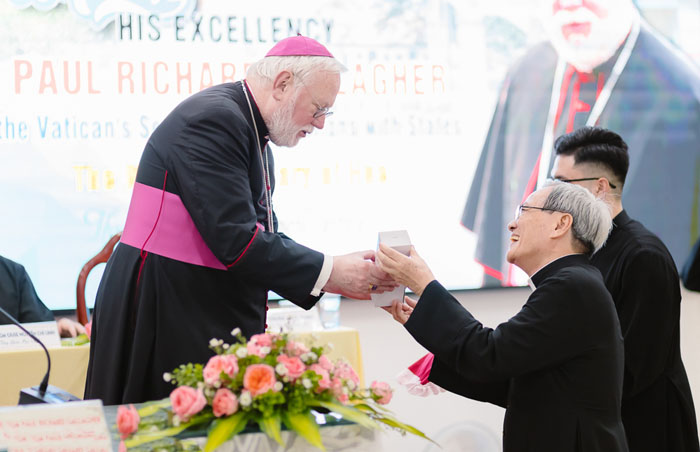 Đức TGM Gallagher đã nhận được những câu hỏi về niềm vui của ngài khi đến và hiện diện ở Việt Nam trong hai ngày qua. Ngài chia sẻ rằng ngài rất vui khi làm việc với giới chức nhà nước cũng như khi gặp gỡ cộng đoàn Dân Chúa, đặc biệt là Thánh lễ tại Nhà thờ Chính tòa Hà Nội đầy ấn tượng… Được hỏi ngài có thể vén mở điều gì có tính khích lệ cụ thể qua những cuộc gặp gỡ với chính quyền Việt Nam, ngài ôn lại tiến trình vun đắp mối quan hệ song phương đã diễn ra từ rất khó khăn dần dần đi đến sáng sủa hơn, và gần đây có những bước tiến ngoạn mục. Việc chính quyền Việt Nam chấp thuận cho Tòa Thánh bổ nhiệm vị Đại diện Thường trú của Giáo hoàng là một bằng chứng như vậy. Ngài cũng đề cập đến khả năng về một chuyến viếng thăm Việt Nam của Đức thánh cha Phanxicô, điều mà ngài biết người Công giáo Việt Nam rất mong đợi. Về việc này, ngài xác nhận đã có sự trao đổi chính thức giữa hai phía, nhưng vẫn còn phải làm việc với nhau một cách chi tiết hơn…