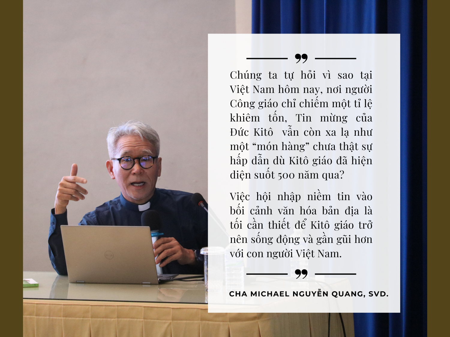 Trong phần thuyết trình của mình, cha Michael Nguyễn Quang tập trung vào khái niệm “thần học bối cảnh” (contextual theology) và cách mà Tin Mừng được hội nhập vào nền văn hóa đặc thù của từng dân tộc. Cha giải thích, thần học là nỗ lực của con người tìm kiếm thánh ý Thiên Chúa, là cuộc đối thoại của Thiên Chúa với con người, diễn ra trong lịch sử cứu độ cũng như trong đời sống cụ thể của từng cộng đồng văn hóa. Thiên Chúa đối thoại qua những nhân vật cụ thể như Adam, Abraham, Môsê, Đức Giêsu và qua các biến cố lịch sử như của dân Do Thái cũng như của mầu nhiệm Nhập Thể và Phục Sinh.
