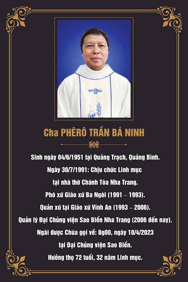 Cha Phêrô Trần Bá Ninh đã được Chúa gọi về lúc 8g00 sáng thứ Hai, ngày 10 tháng 04 năm 2023 tại Đại Chủng viện Sao Biển Nha Trang trong niềm tiếc thương của toàn thể gia đình chủng viện.