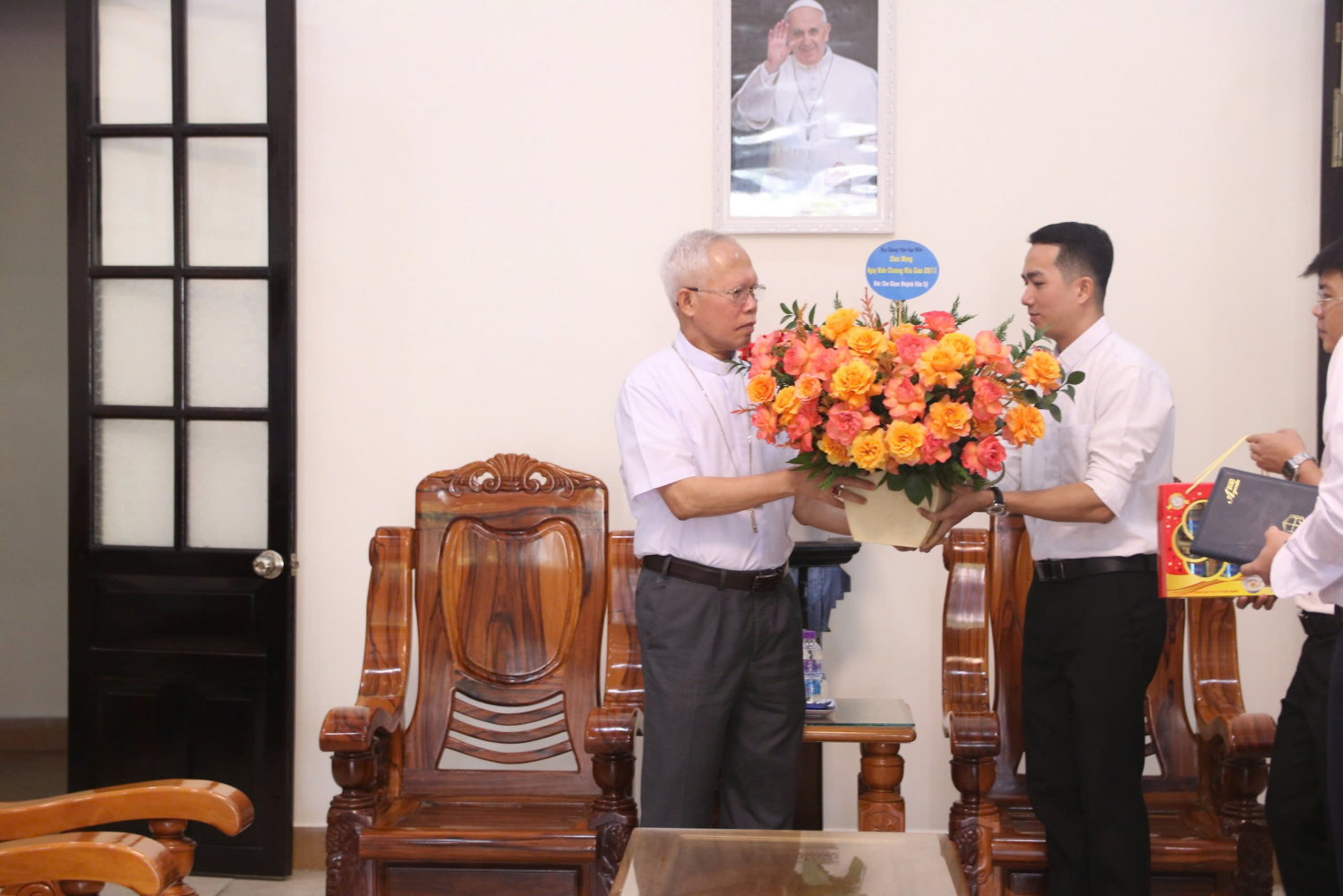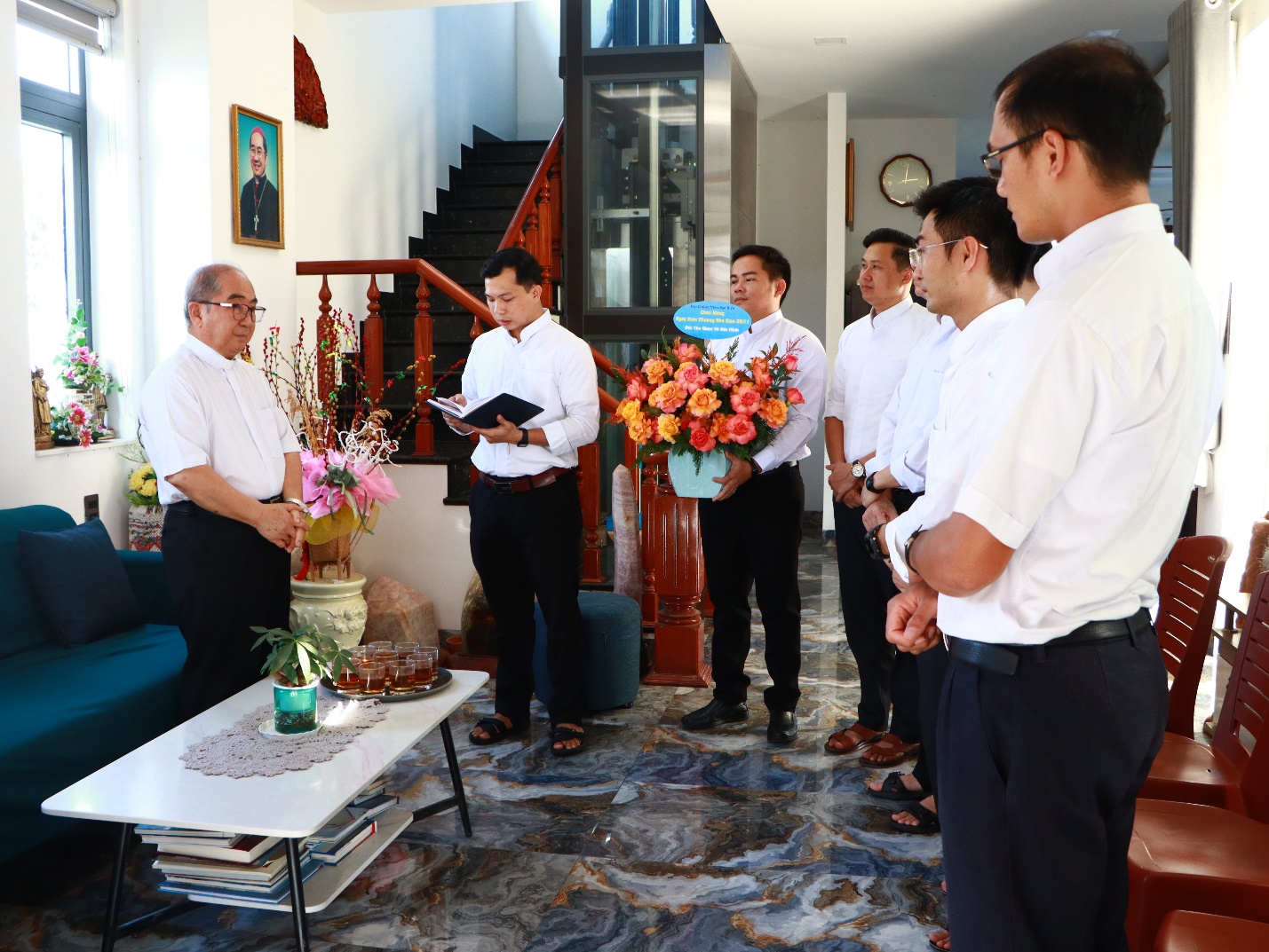 Cũng trong dịp này, các chủng sinh đã đến thăm và chúc mừng Đức cha Giuse Võ Đức Minh, nguyên Giám mục Giáo phận Nha Trang, để bày tỏ lòng biết ơn ngài. Hiện tại, Đức cha vẫn giảng dạy Thánh kinh tại Đại Chủng viện Sao Biển. Trong buổi gặp gỡ, Đức cha chia sẻ về những trải nghiệm học tập từ Tiểu Chủng viện đến Đại Chủng viện Sài Gòn và thời gian du học nước ngoài. Ngài nhấn mạnh một lợi thế quan trọng của người Việt Nam là chữ Quốc Ngữ, một hệ thống chữ viết dựa trên mẫu tự Latinh. Điều này giúp người Việt dễ dàng tiếp cận với nhiều ngôn ngữ quốc tế và mở rộng khả năng học hỏi, đặc biệt trong các lĩnh vực như thần học và khoa học. Với hơn 50 năm giảng dạy Kinh Thánh, Đức cha đã cống hiến cho việc đào tạo chủng sinh tại các Đại Chủng viện và nhiều học viện dòng tu ở Việt Nam. Đây là dịp để các chủng sinh tri ân và tiếp nối những giá trị mà ngài đã truyền lại.