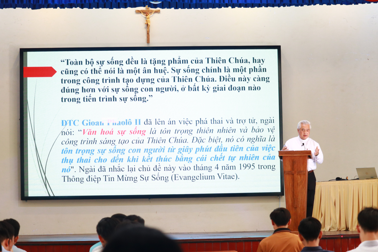 Từ đó, diễn giả cho thấy sự sống con người, từ lúc hình thành cho đến lúc kết thúc, luôn là một tiến trình kỳ diệu nằm trong kế hoạch yêu thương của Thiên Chúa. Nhấn mạnh bổn phận tôn trọng và bảo vệ tính thánh thiêng của sự sống con người, Cha Phêrô dẫn lại nguyên tắc cơ bản được Huấn quyền giảng dạy: