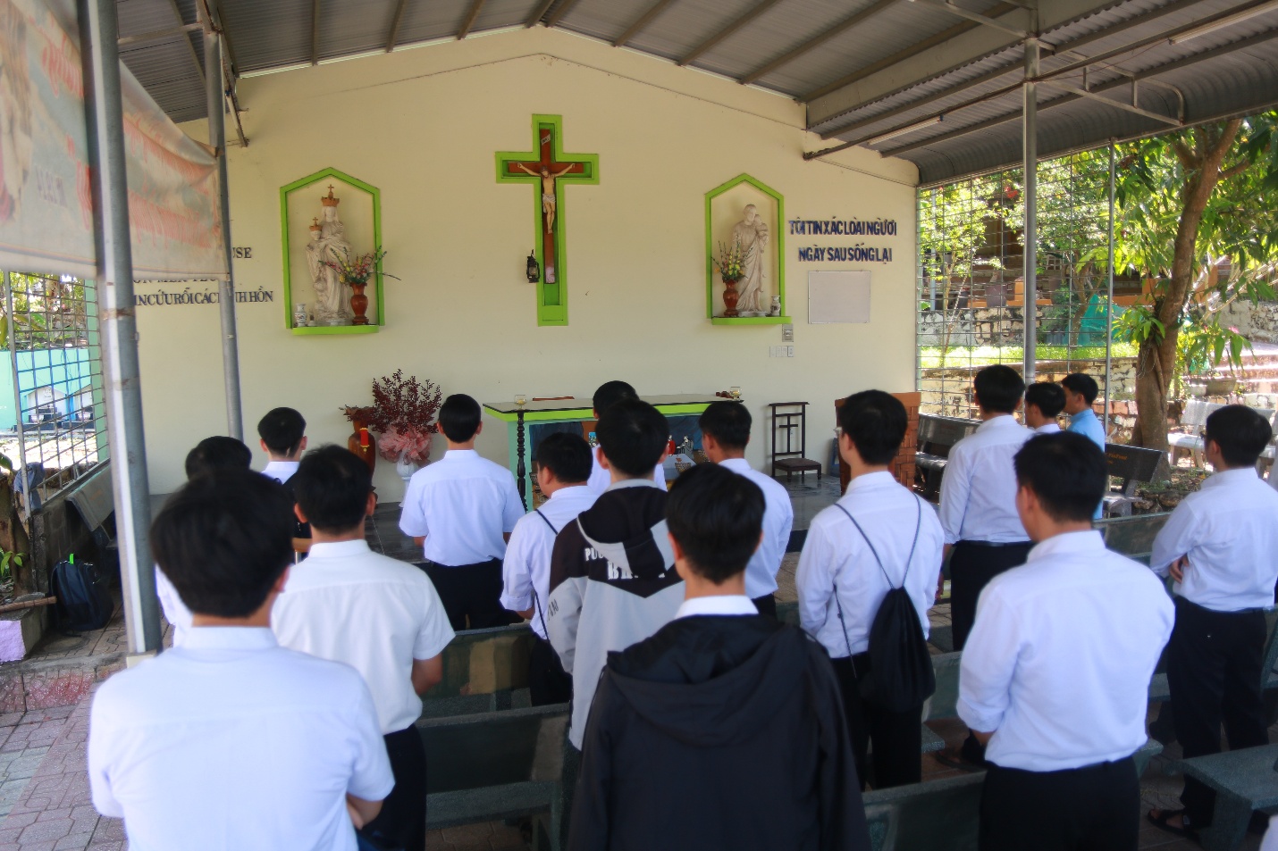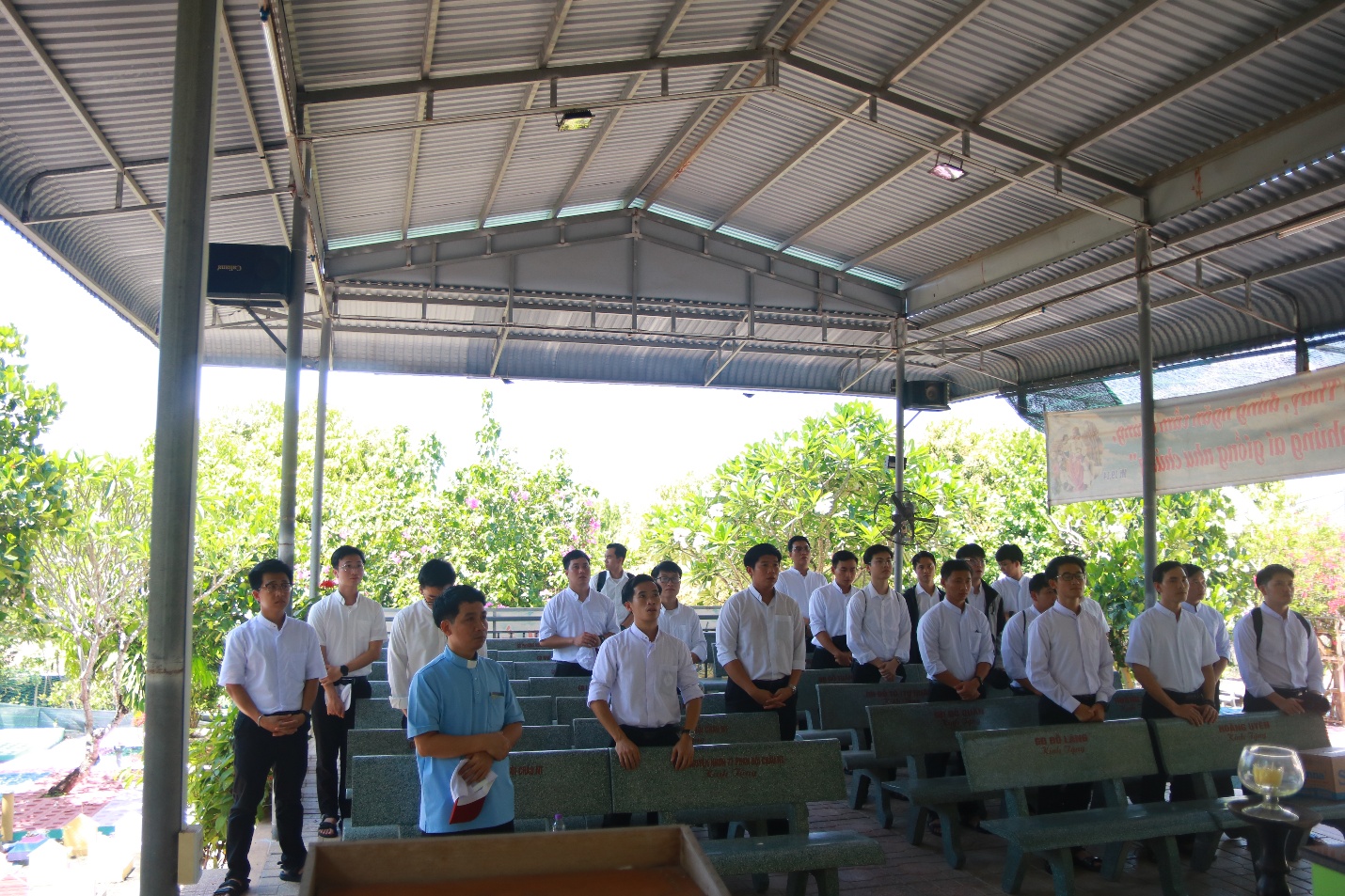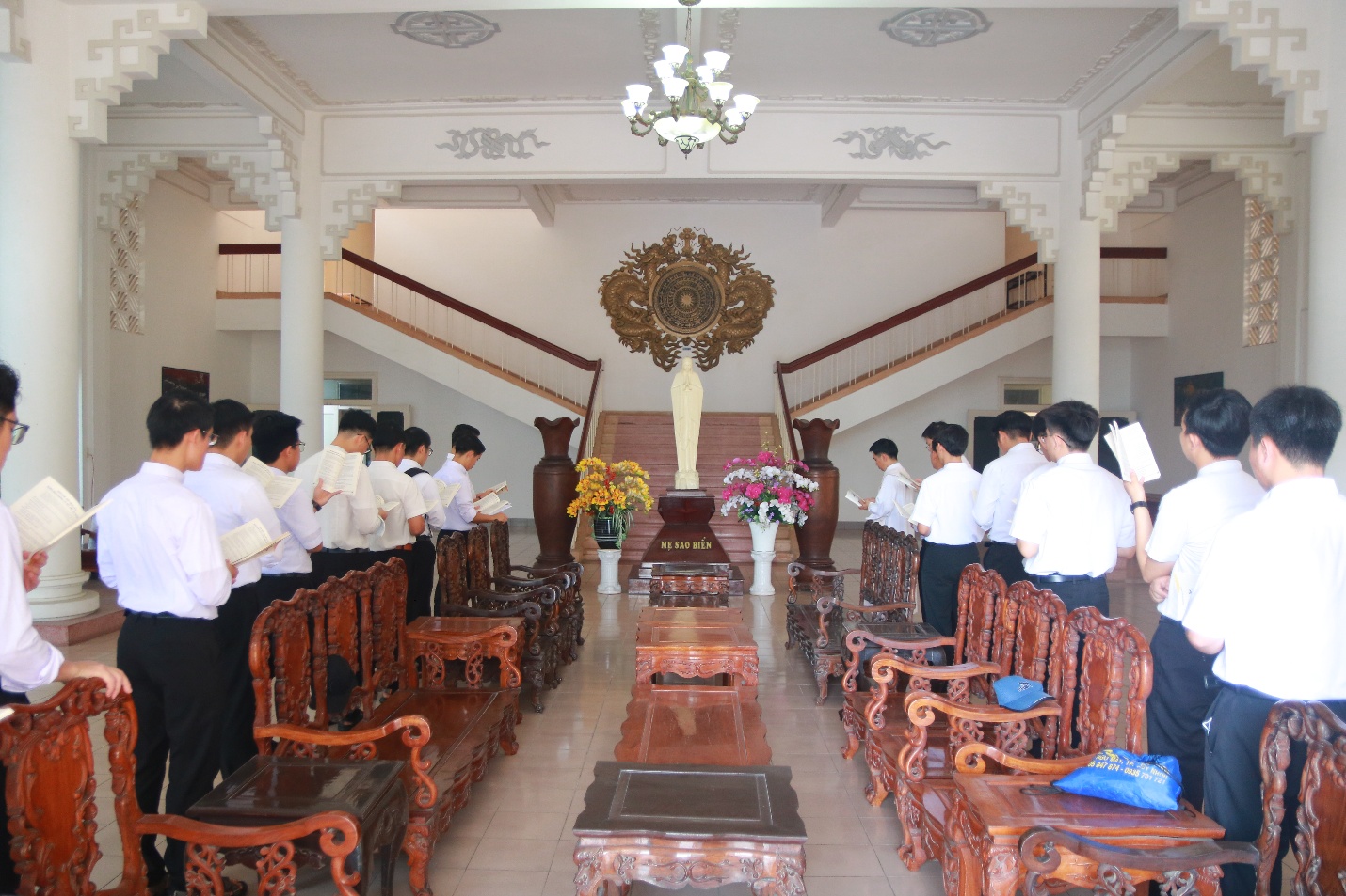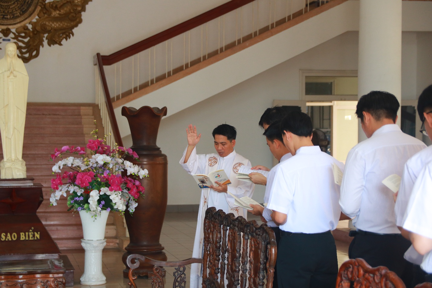 Vào lúc 7h45 cùng ngày, trước Mẹ Sao Biển tại Phòng Khánh Tiết Đại Chủng Viện, Cha đồng hành và quý Thầy cử hành Nghi thức chúc lành cho đoàn hành hương lúc bắt đầu lên đường.