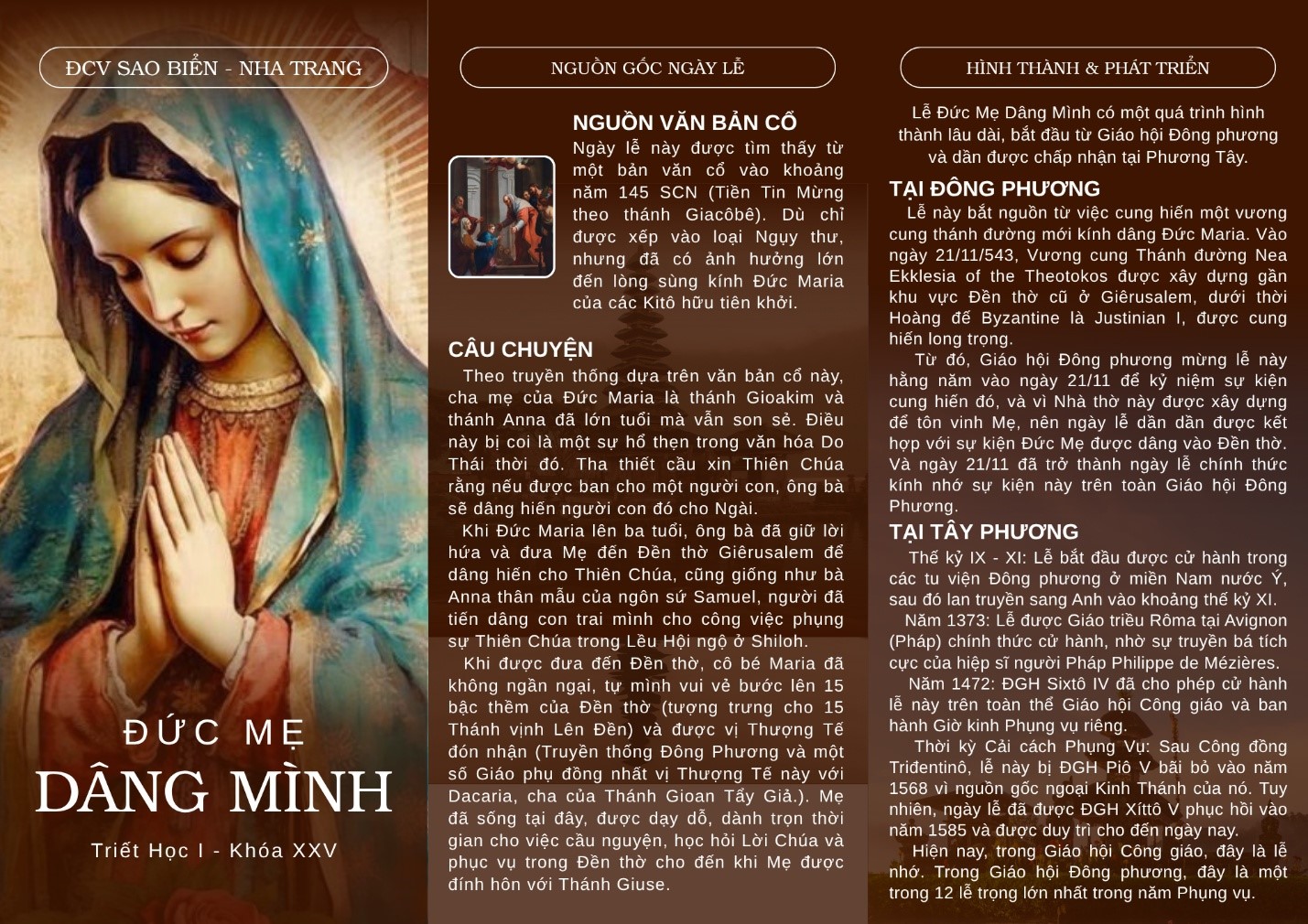 Cùng với toàn thể Giáo hội, sáng ngày 21 tháng 11 năm 2025, trong bầu khí thiêng liêng tại Đại Chủng viện Sao Biển Nha Trang, Thánh lễ mừng kính Đức Mẹ Dâng Mình Trong Đền Thờ, Bổn mạng lớp Triết học I, được cử hành long trọng.