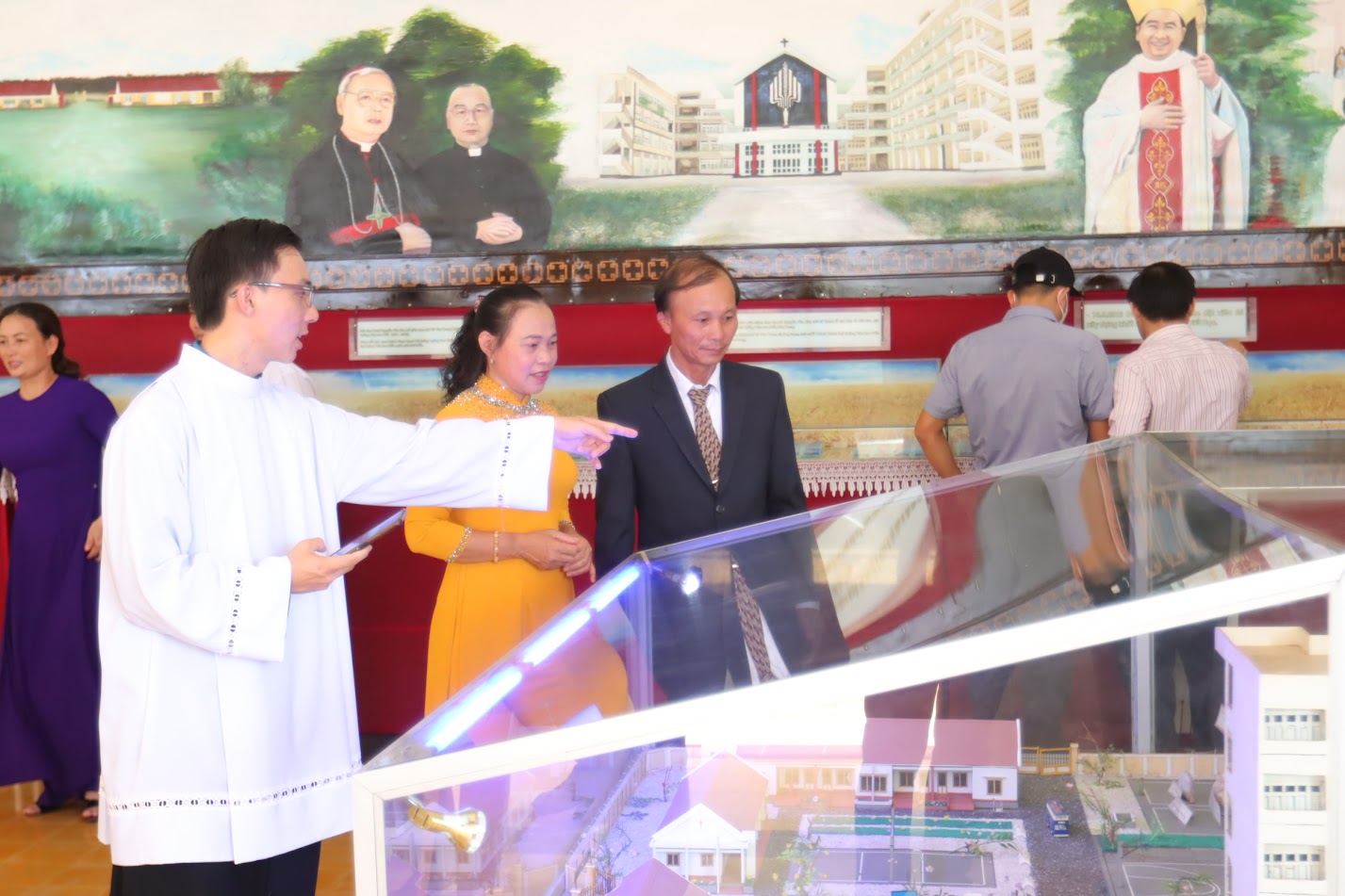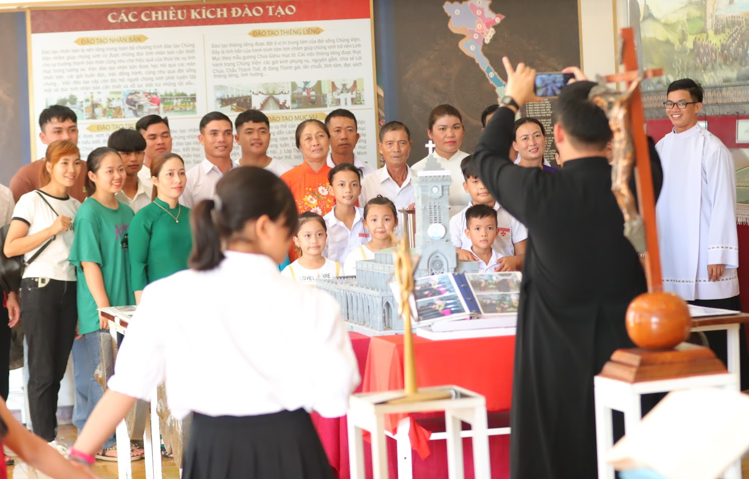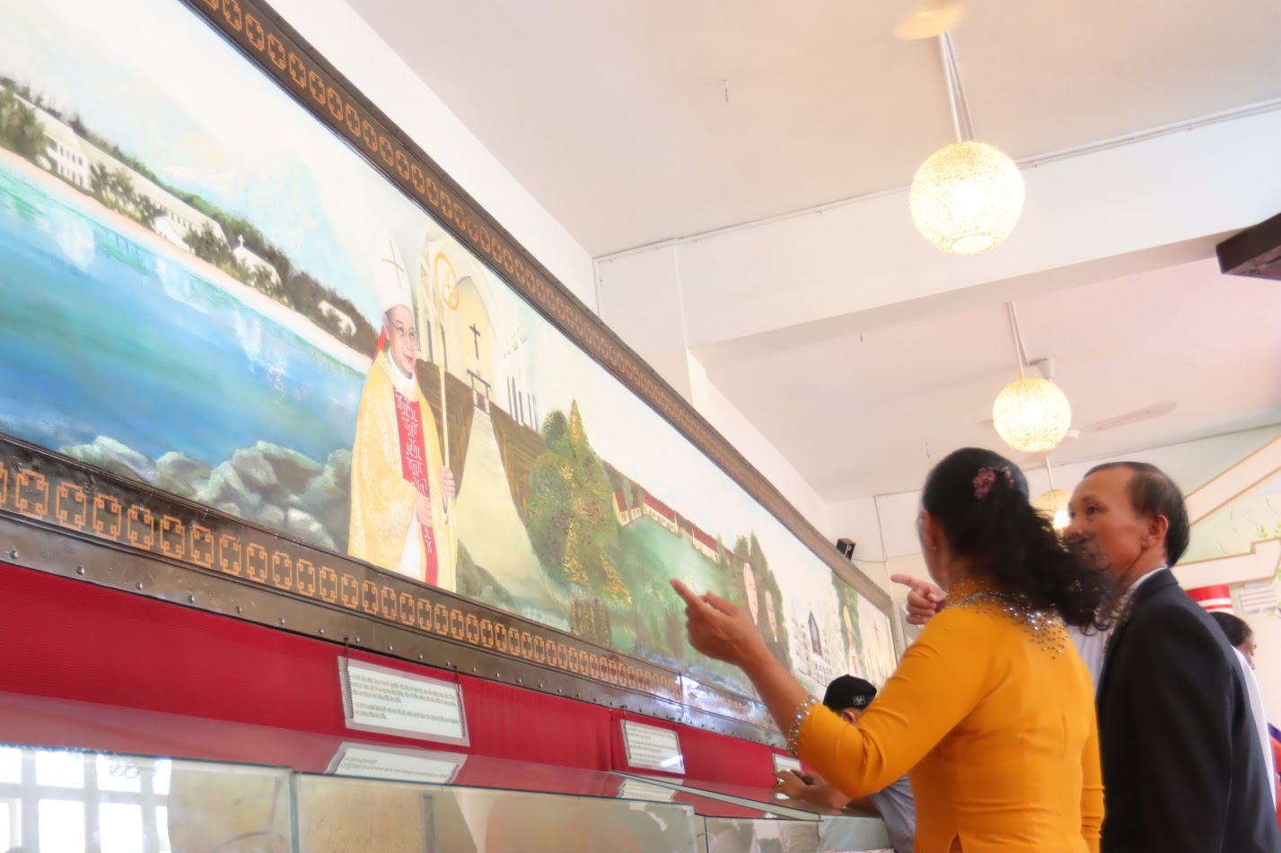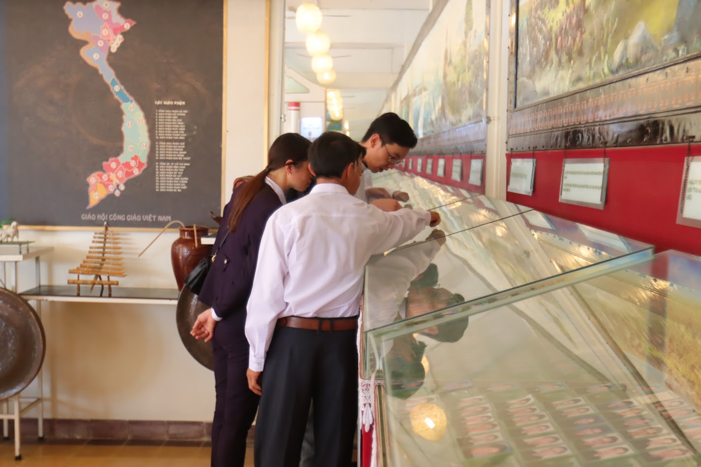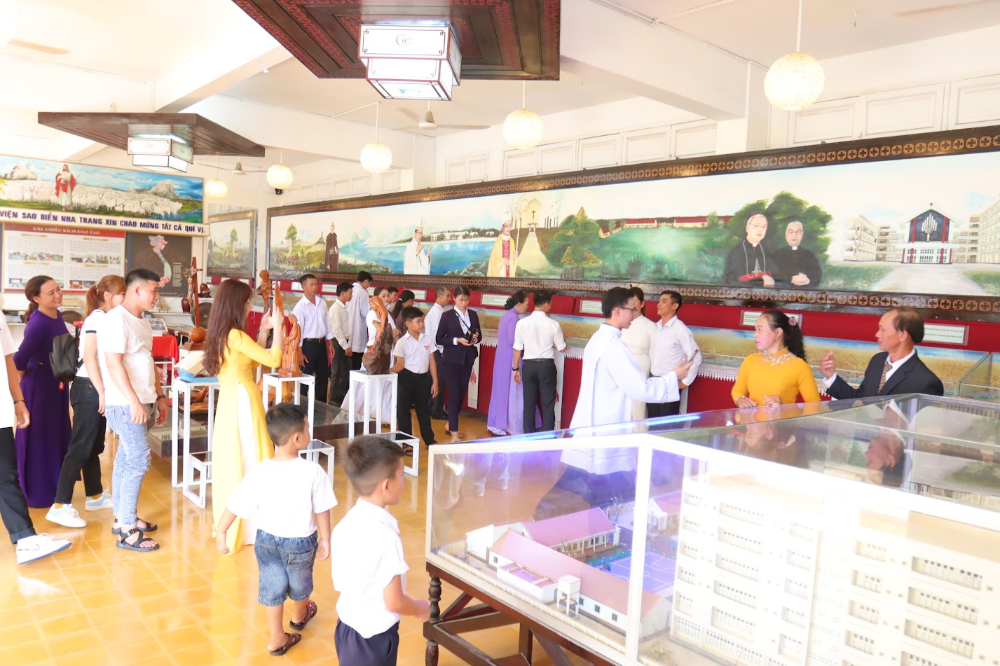 Quan khách tại phòng truyền thống, không gian trưng bày nhiều hình ảnh và di vật đặc biệt, lưu giữ những ký ức thiêng liêng của lịch sử chủng viện