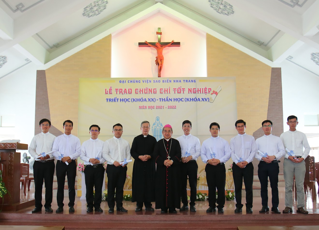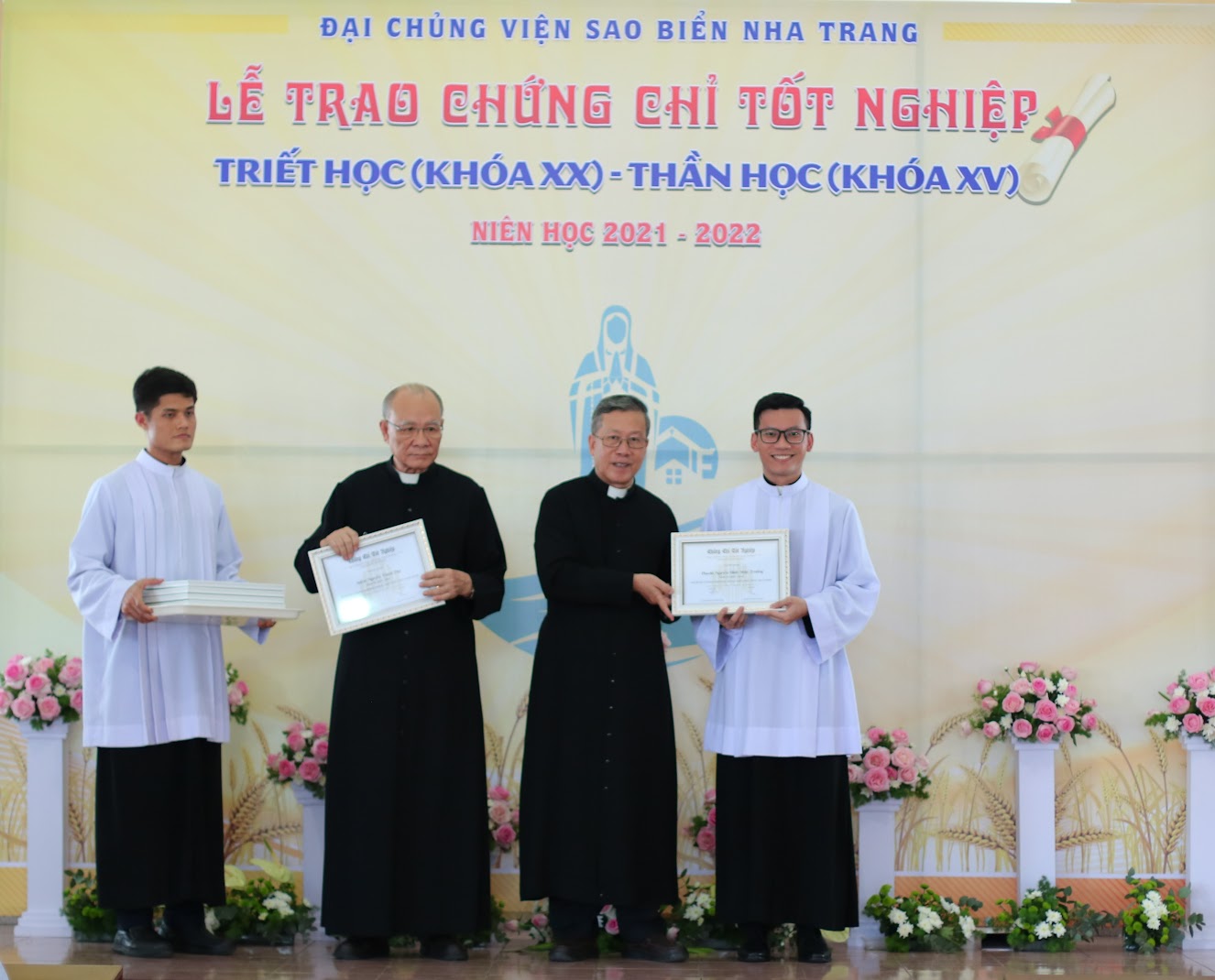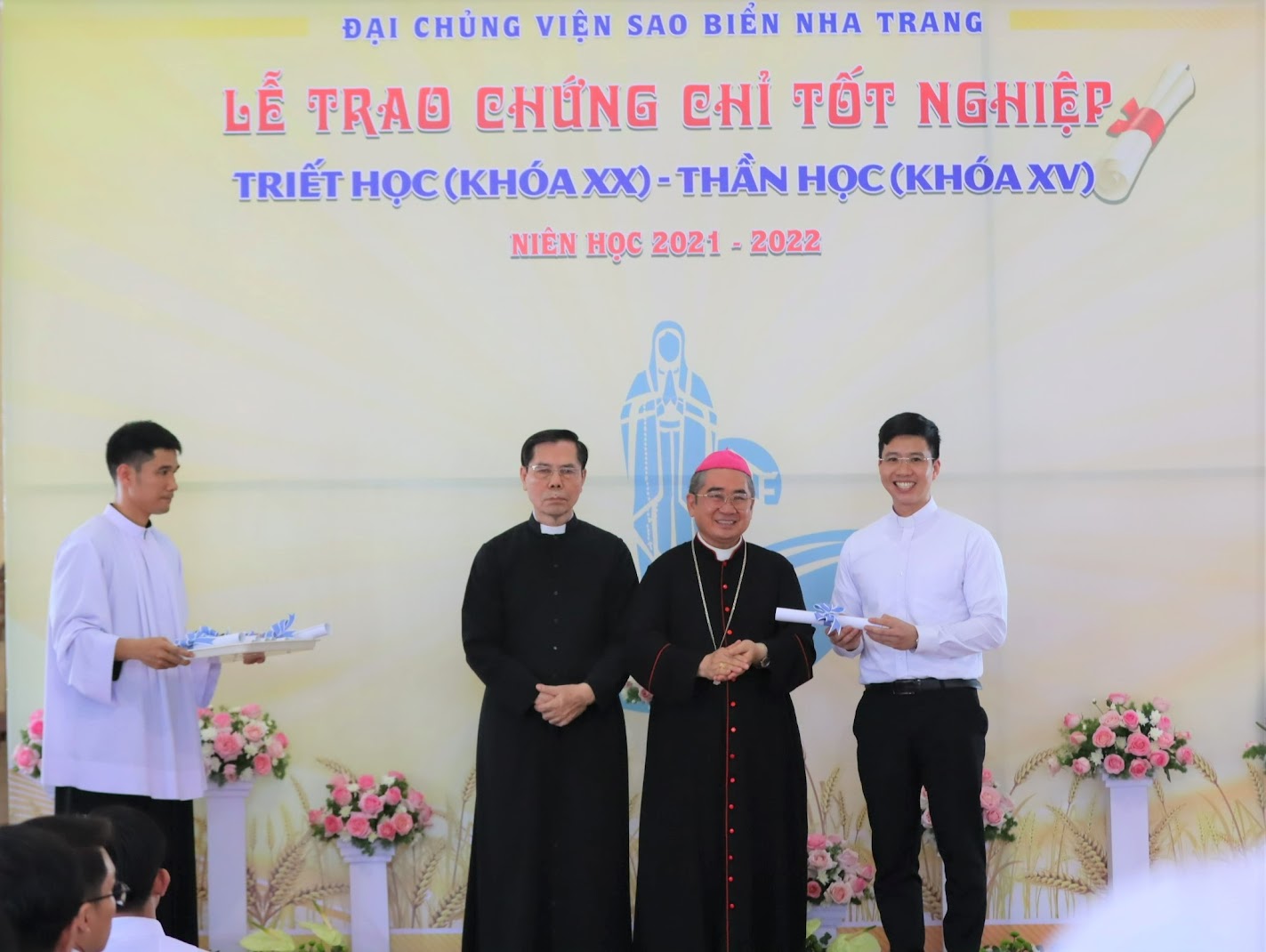 Tiếp đến là nghi thức trao chứng chỉ hoàn thành chương trình Triết học và Thần học của ĐCV Sao Biển cho 72 chủng sinh, và trao bằng cử nhân Thần học (STB) của Đại học Urbaniana cho 9 tân linh mục thuộc giáo phận Nha Trang.