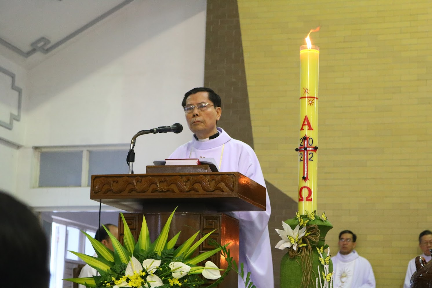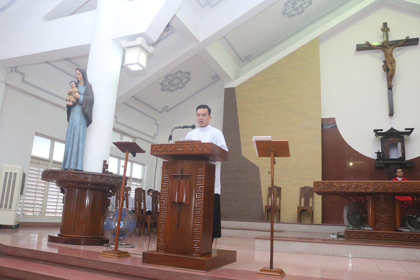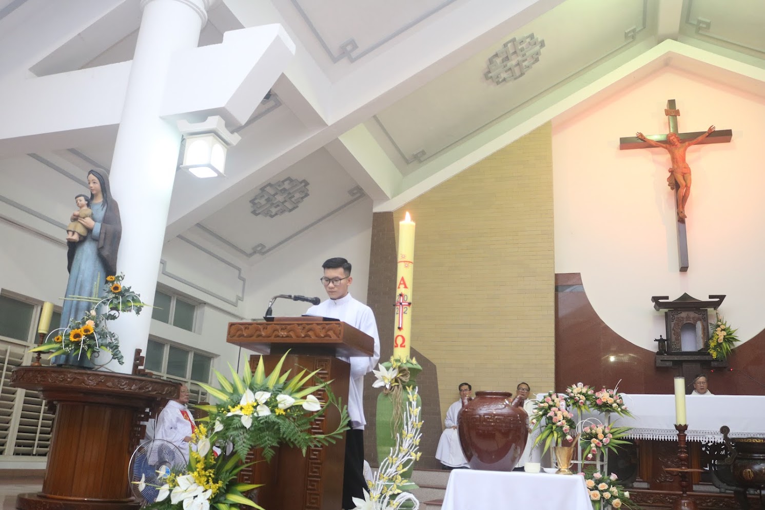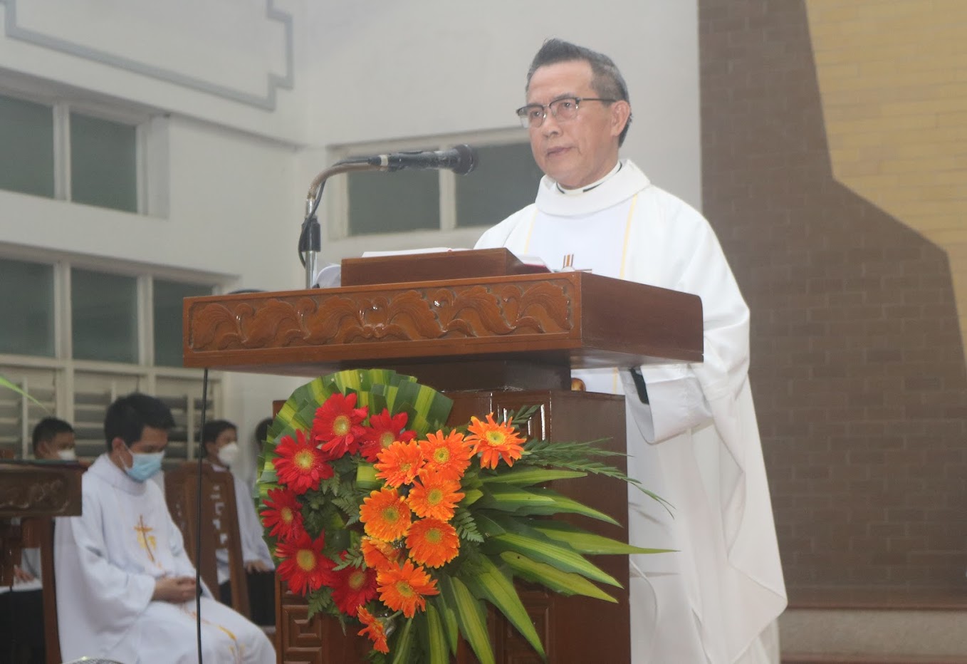 Giảng trong Thánh lễ hôm nay, Cha Phó Giám đốc Gioan Bosco Cao Tấn Phúc diễn tả lại tâm trạng bi ai sụp đổ của các tông đồ trước cái chết thập giá của Thầy Giêsu. Đứng trước ngôi mộ trống, Gioan đã thấy và đã tin. Niềm tin vào Đấng Phục sinh của con người hôm nay cũng phải trải qua nhiều thử thách. Phục sinh nào cũng đòi hỏi những hy sinh và chung phần với con đường thập giá. Làm chứng cho niềm tin Kitô cũng là chấp nhận mạo hiểm, dám hy sinh vì những điều thiện hảo, cho dù có bị thế gian phản bội hay đánh lừa.